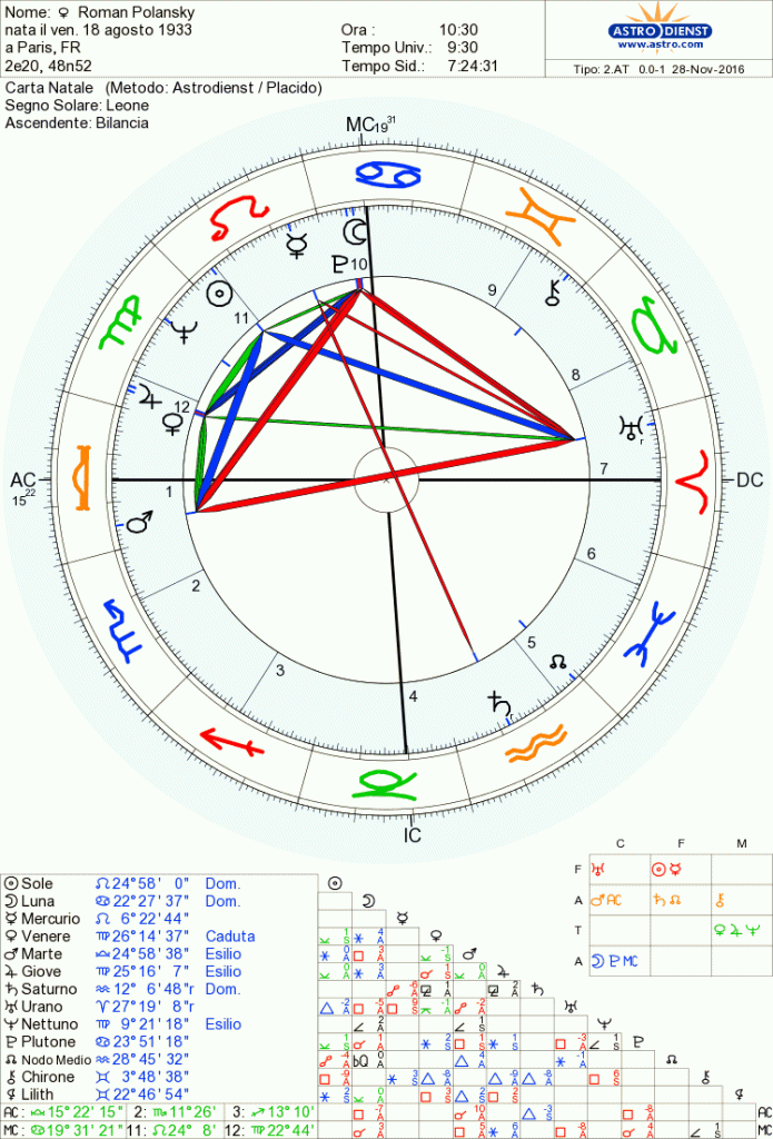 Polanski presenta nel suo tema natale una forte Luna in Cancro (segno legato al grembo materno di cui la Luna stessa è governatrice), oscurata dalla pesante congiunzione con Plutone (Dio degli inferi) al Medio Cieli (popolarità), quadrata a Marte e ad Urano, aspetti che possono parlare chiaramente di trauma e violenza legati alla moglie/Luna, strappata alla vita con estrema violenza, ma altresì può parlare del successo riscosso dalla proiezione di quel film suddetto che gli ha dato tanta popolarità. La Luna di Polanski è pesantemente segnata da più punti di vista, infatti ci può parlare sia delle sue radici famigliari, così travagliate, tanto che da bambino vive l’esperienza del ghetto, in Polonia, da cui riesce a fuggire, mentre la madre morirà nei campi di sterminio; sia dello scandalo che lo vede coinvolto in uno stupro ai danni di una giovane minorenne…